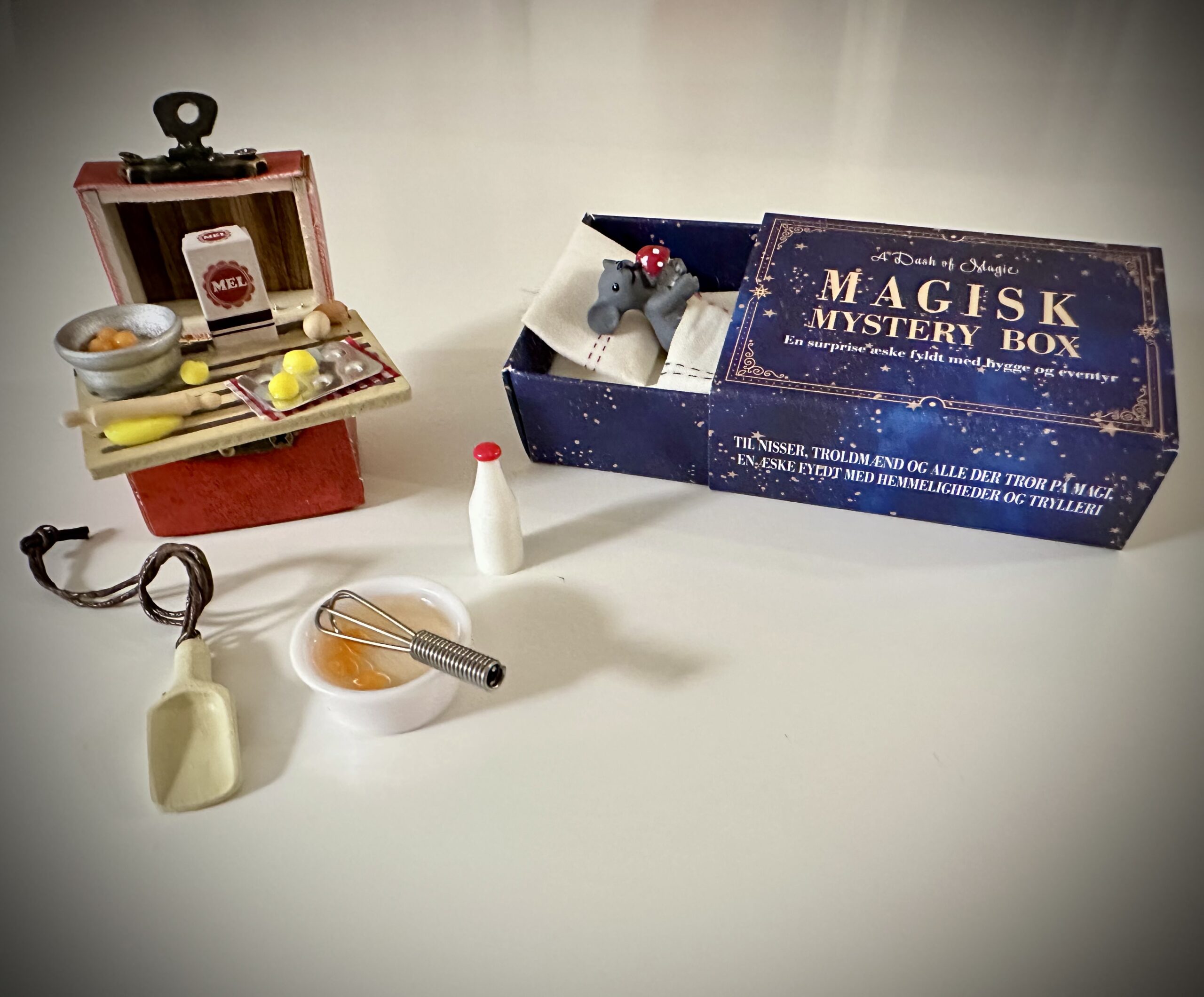 Magisk tilbehør til nissedøren – klar til brug. Nissens drømme-æske & bagekiste er det perfekte sæt til dig, der vil skabe ægte nissemagi i december. Du får en fin lille æske, som forvandles til en nisseseng når den åbnes og en lille bagekiste fyldt med detaljer, der gør det let at skabe spor fra Nissen ved nissedøren.