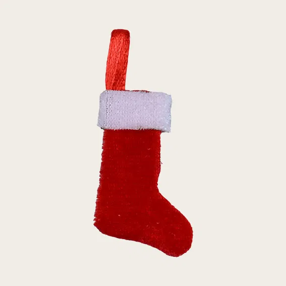 Den lille sok er 4 cm høj, syet i blødt polyester i klassisk rød med hvid kant præcis som vi kender den fra vores egne julesokker. Perfekt til at hænge ved nissedøren, på en lille krog eller som en del af et hyggeligt nissedrilleri.