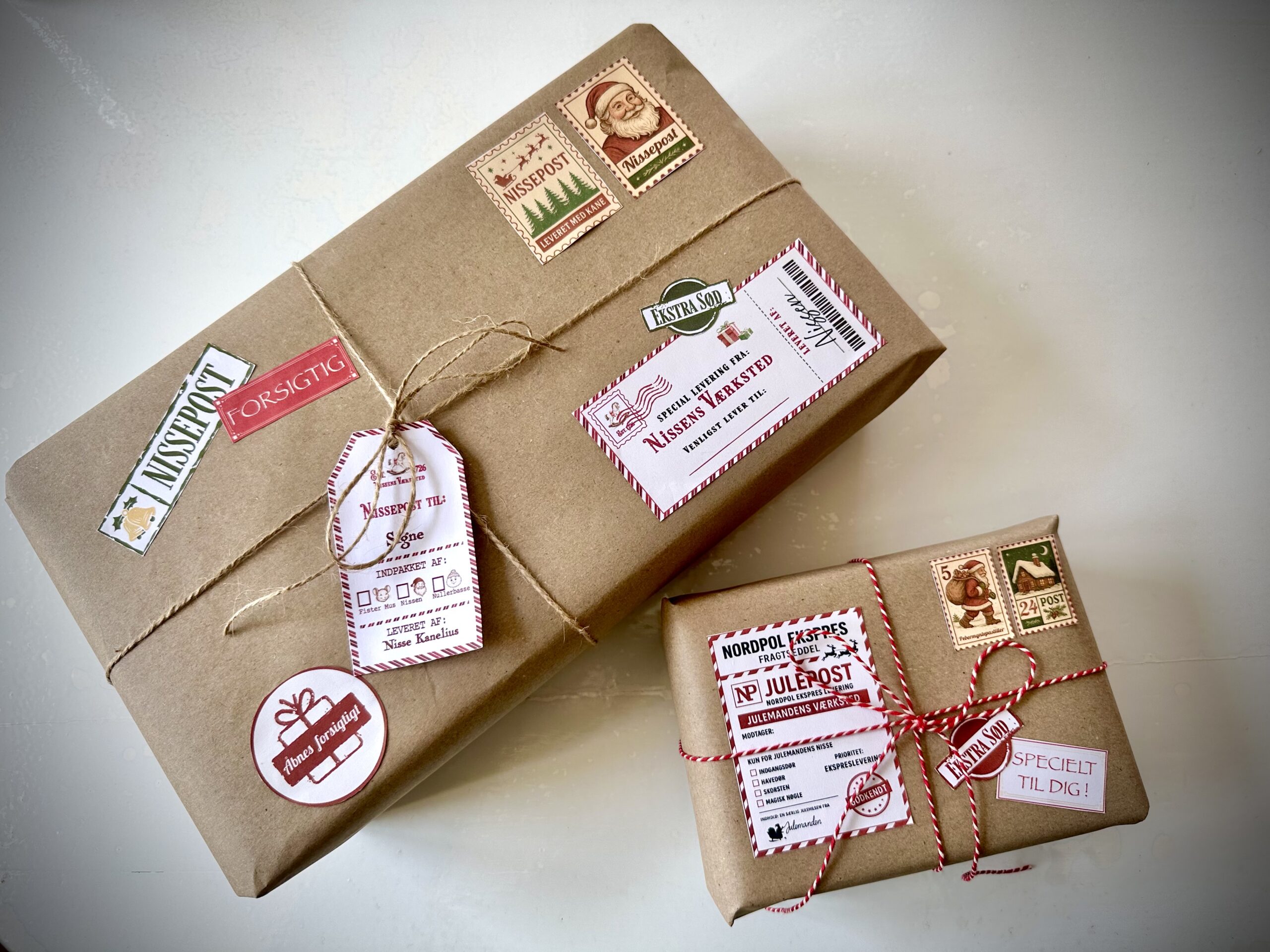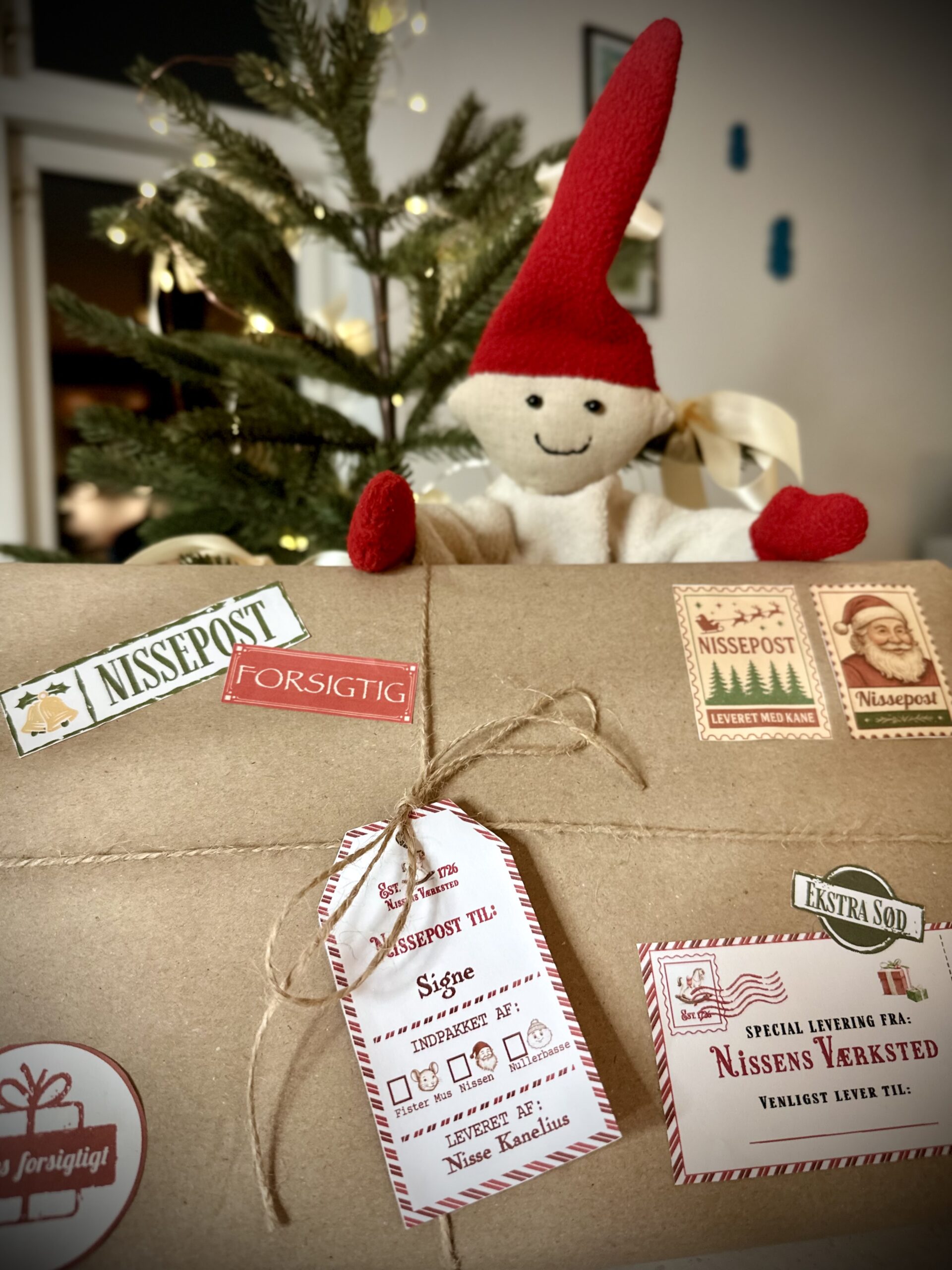 – Nissens mini bøger, flaskelabels, magiske mærkater, mini nissekvittering og kort til slikstok.