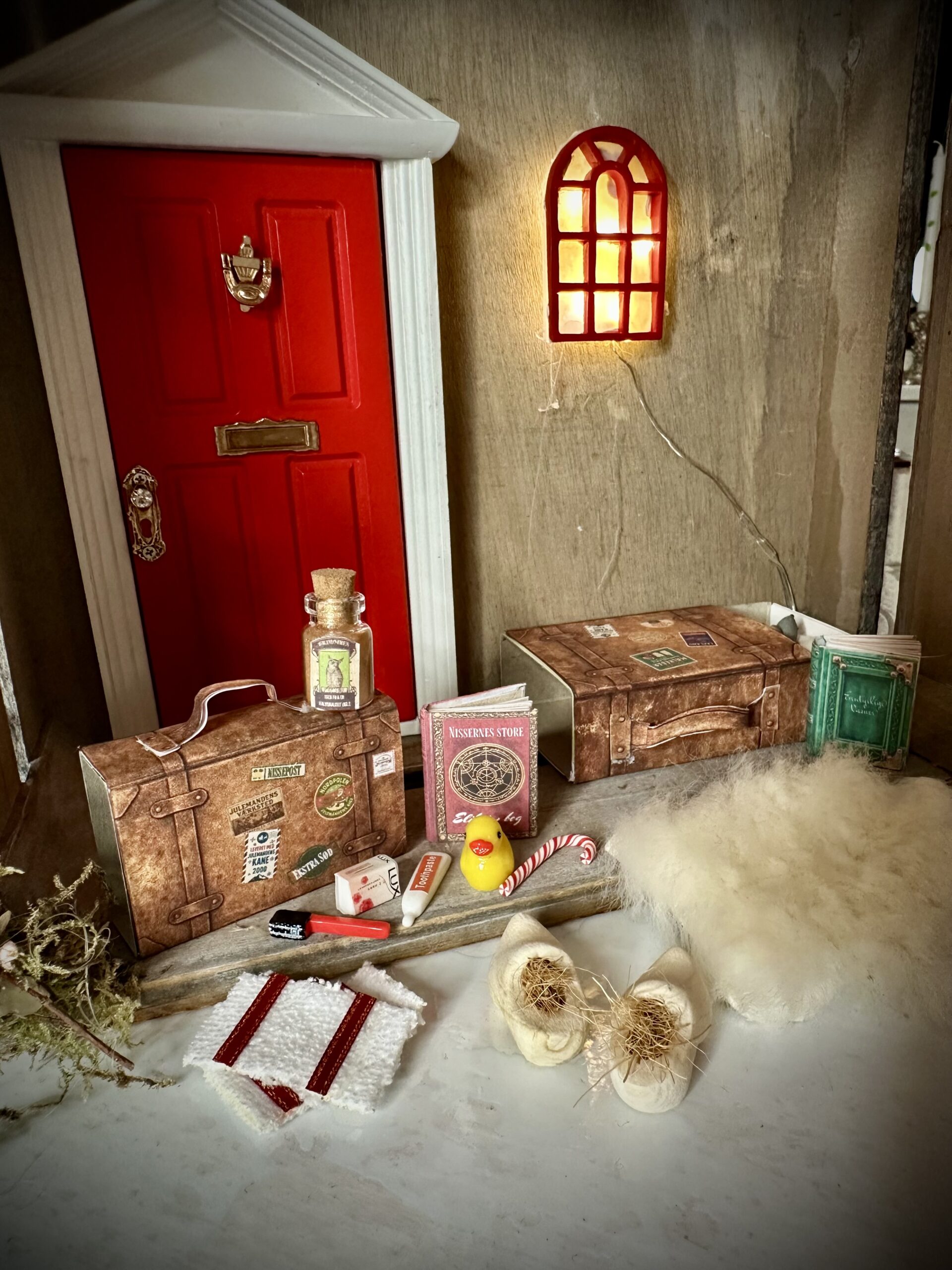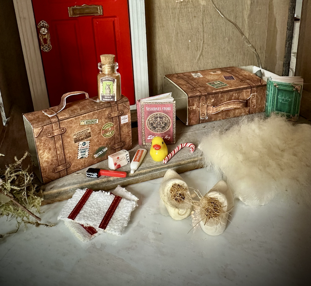 Når nissen flytter ind, har han selvfølgelig sin kuffert med sig, fyldt med alle de små ting han ikke kan undvære. Med dette magiske kuffert sæt får du en hel rejsekuffert med nissens yndlingsting, som gør hans verden endnu mere levende og fuld af julemagi. Sættet indeholder alt det, en travl nisse har brug for: en lille tandbørste, håndklæde, sæbe og tandpasta og en gul bade and, til hverdagens rutiner og selvfølgelig en slikstok til de søde stunder. Der er også nissetræsko, en eliksirflaske med magisk nissebryg-labels, og saml selv miniature nissebøger . For at fuldende oplevelsen får du også to rejsekufferter, som du selv kan printe og klistre på tændstikæsker, så de ligner ægte kufferter direkte fra nissernes verden.